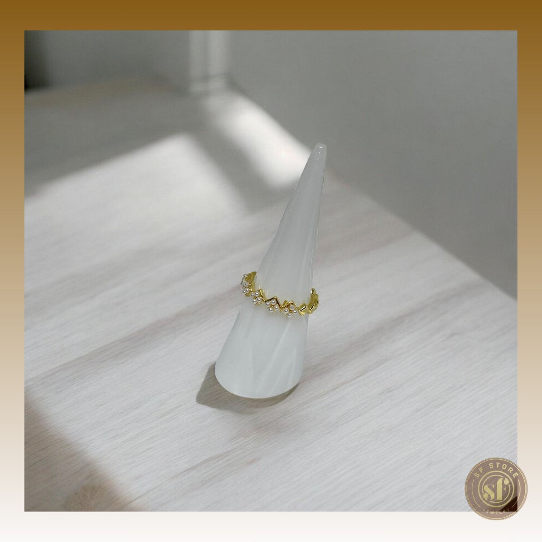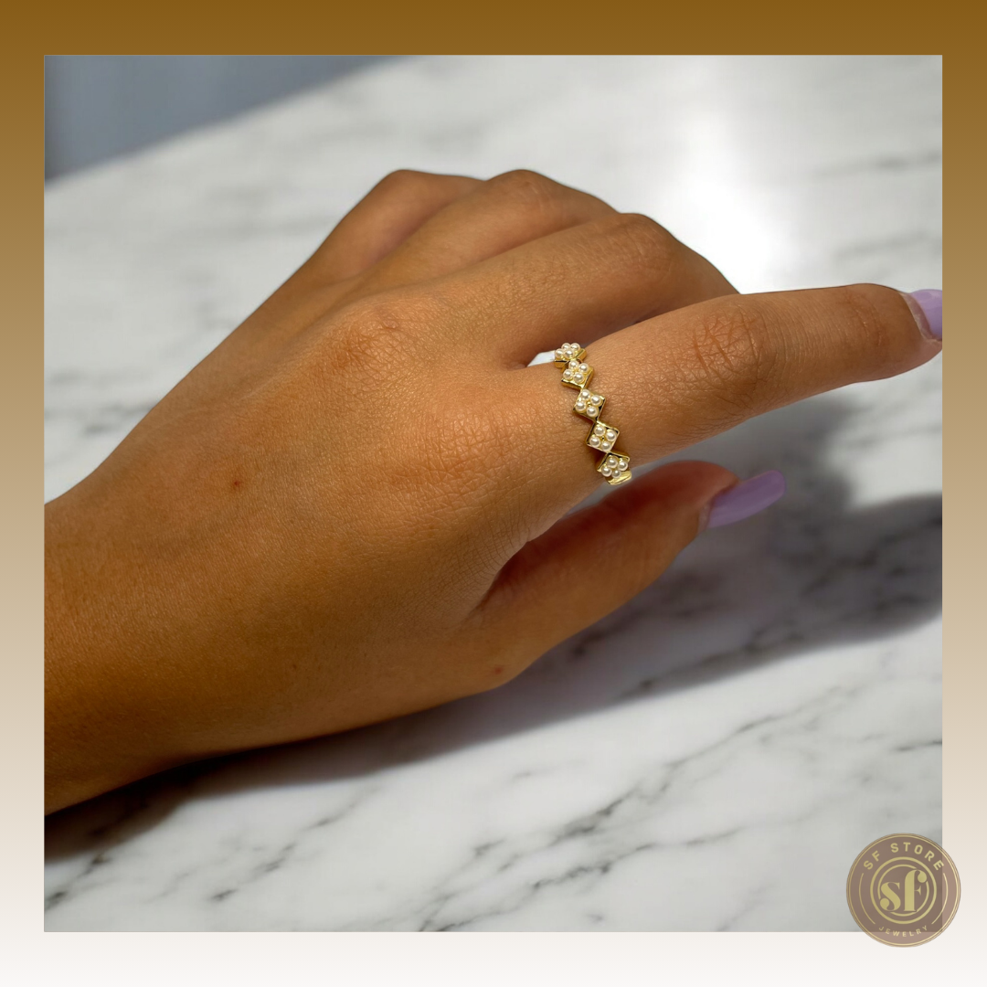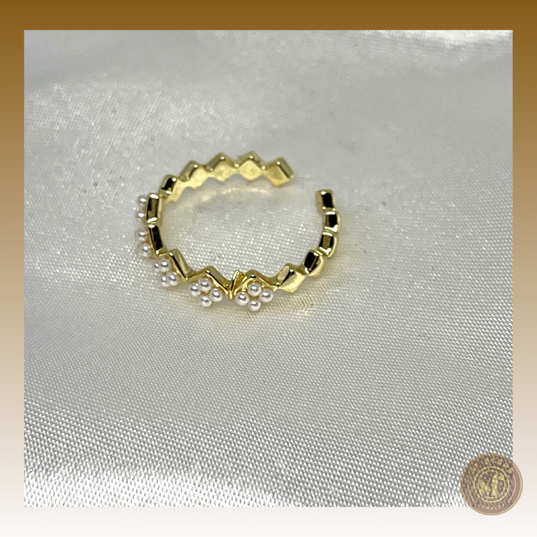 O Anel Beauty é uma peça sofisticada que une um design contemporâneo com um toque clássico. Com uma estrutura ajustável, este anel apresenta quadrados geometricamente desenhados, cada um adornado com delicadas pérolas, criando um visual harmonioso e refinado.