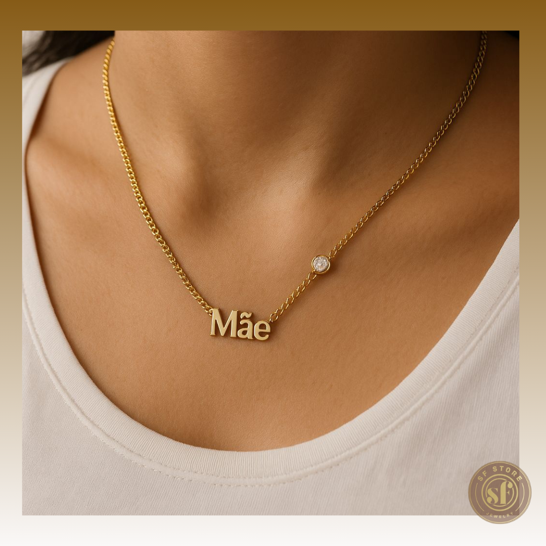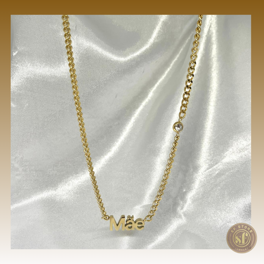 Celebre o amor e a ligação especial com a sua mãe com este elegante colar em aço inoxidável. Com a palavra "Mãe" delicadamente recortada, esta peça torna-se um símbolo de afeto e apreço. A corrente sofisticada é complementada por um pequeno brilhante embutido, adicionando um toque de brilho e glamour. Ideal para presentear a sua mãe, é uma peça cheia de significado e estilo.