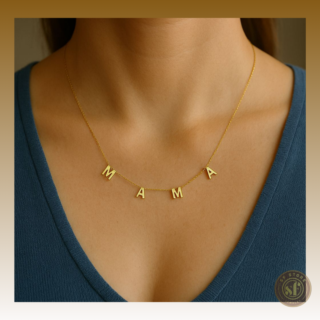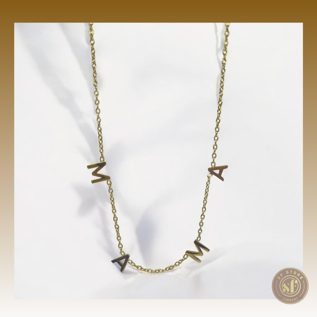 Um colar elegante e resistente que carrega um grande significado. As quatro letras formam a palavra MAMA, simbolizando amor eterno, força e carinho. Um tributo simples e bonito à figura materna, perfeito para oferecer ou guardar junto ao peito.