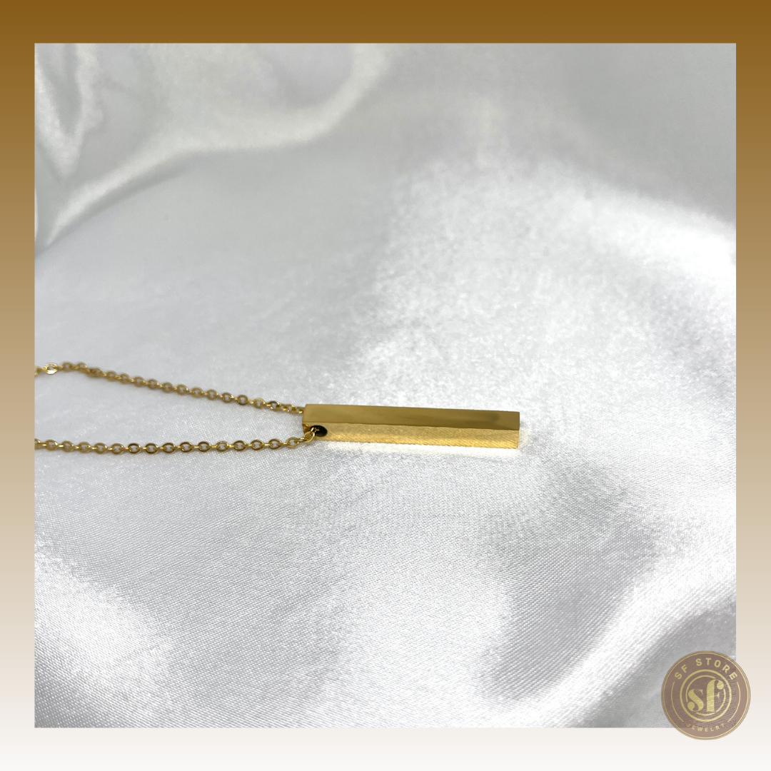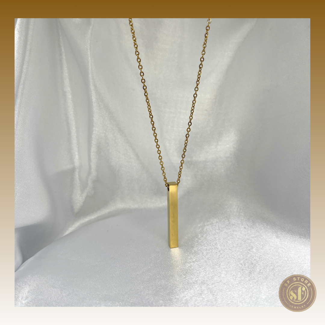 Um colar com uma barra vertical elegante que lhe permite gravações a laser nos 4 lados, oferecendo assim a máxima personalização possível. A barra é ideal para gravar palavras significativas, nomes, datas especiais, símbolos ou qualquer mensagem personalizada que você deseje carregar consigo. O design versátil da barra vertical permite que o colar seja uma peça discreta e elegante, perfeita para ocasiões especiais ou para adicionar um toque pessoal ao seu estilo diário. Este colar é a escolha ideal para quem procura um acessório único que combine significado e sofisticação.
