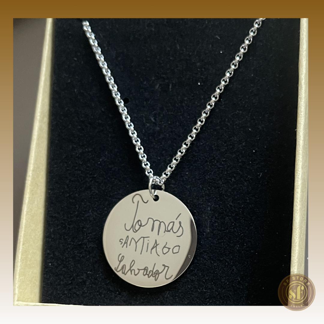 Dê um toque especial ao seu colar, escolhendo uma gravação personalizada. Pode optar por: Letra de máquina: Para um acabamento limpo e elegante, perfeito para quem aprecia simplicidade e modernidade ou Letra manuscrita: Para um toque mais pessoal e caloroso, ideal para quem valoriza a individualidade. Feita em aço inoxidável, a sua medalha será gravada a laser, tornando-se numa peça única, ideal para si ou para presentear alguém especial.