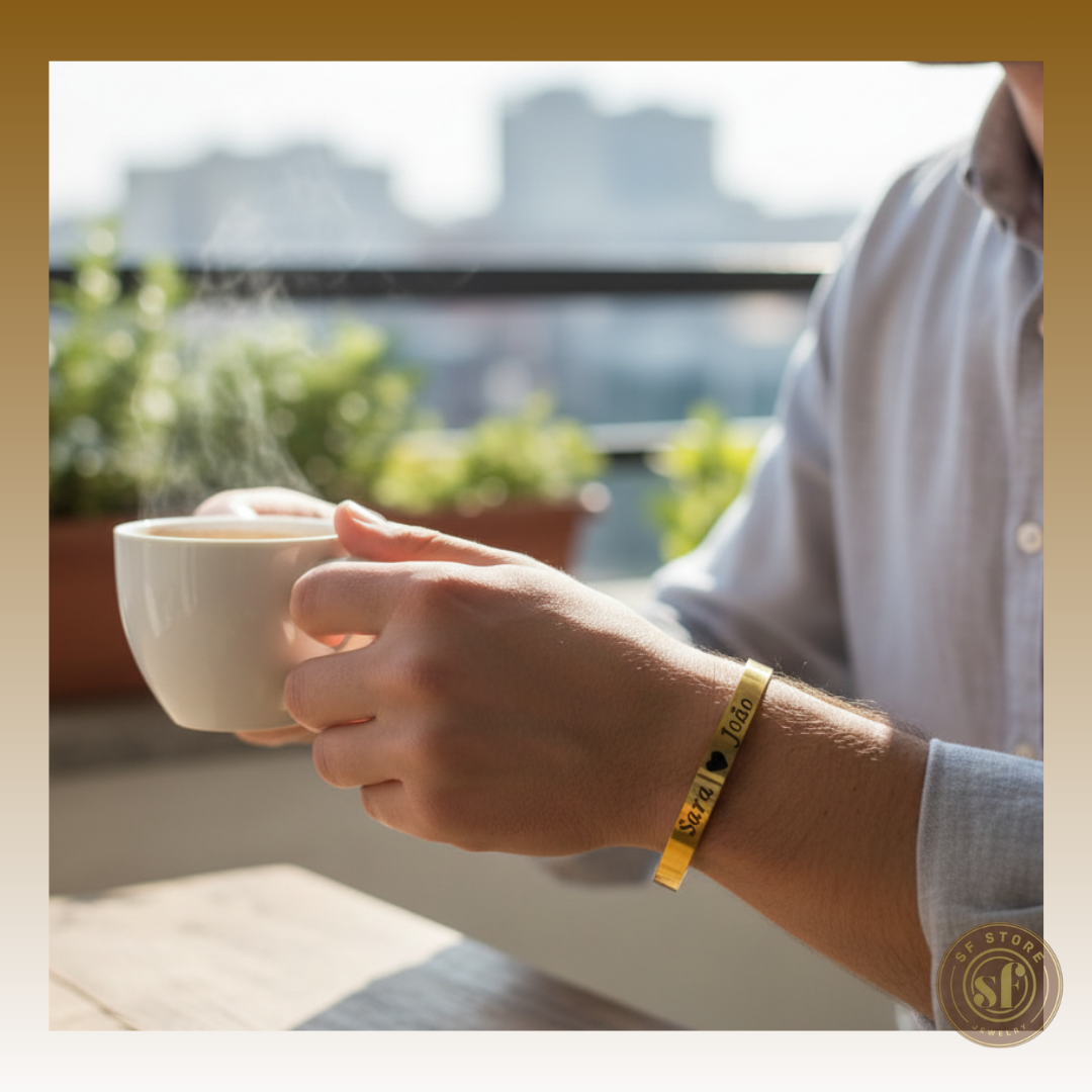 Esta pulseira unissexo em aço inoxidável é ajustável para um encaixe perfeito e pode ser personalizada em ambos os lados. Um acessório durável e versátil, ideal para expressar o seu estilo ou oferecer como um presente exclusivo e significativo.
